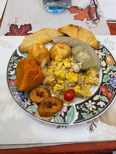 Jamaican breakfast on Christmas morn: ackee and saltfish, fried dumpling, plaintain, green banana, bammy, breadfruit, my father’s perfect porridge…